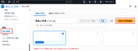 1.AWSコンソールにログインする。「Billing and Cost Management」>「設定」の「支払い設定」をクリックする。