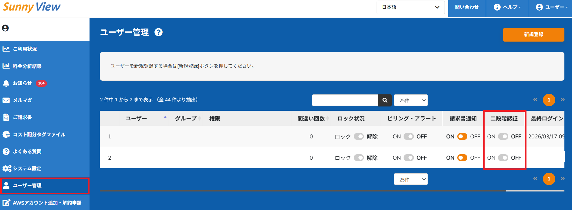 SunnyViewにログインする際の二段階認証の設定方法を知りたいです。 SunnyViewサポート 2026年03月24日 07:01 更新 左側メニューの「ユーザー管理」より「二段階認証」を有効(ON)にしていただくと、ログイン時に担当者様のメールアドレス宛へ認証用のパスコードが送信されるようになります。